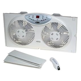 With a remote control for convenient adjustment, this double window fan draws in fresh, cool air from the outside or exhausts stale, hot air from inside. It can also do both simultaneously, because each of the two fans can be set independently to draw in or exhaust out, allowing the unit to exchange inside and outside air. Operable either manually or automatically, with its programmable thermostat turning the fans off and on to maintain a selected temperature--the unit has three speeds, electronic controls, and an LCD screen showing the selected temperature and the room temperature. The twin fan is designed to fit double-hung, vertical-slider, and casement windows. Overall, the unit is 13 inches high, arrives fully assembled, and carries a five-year warranty against defects.